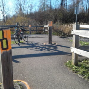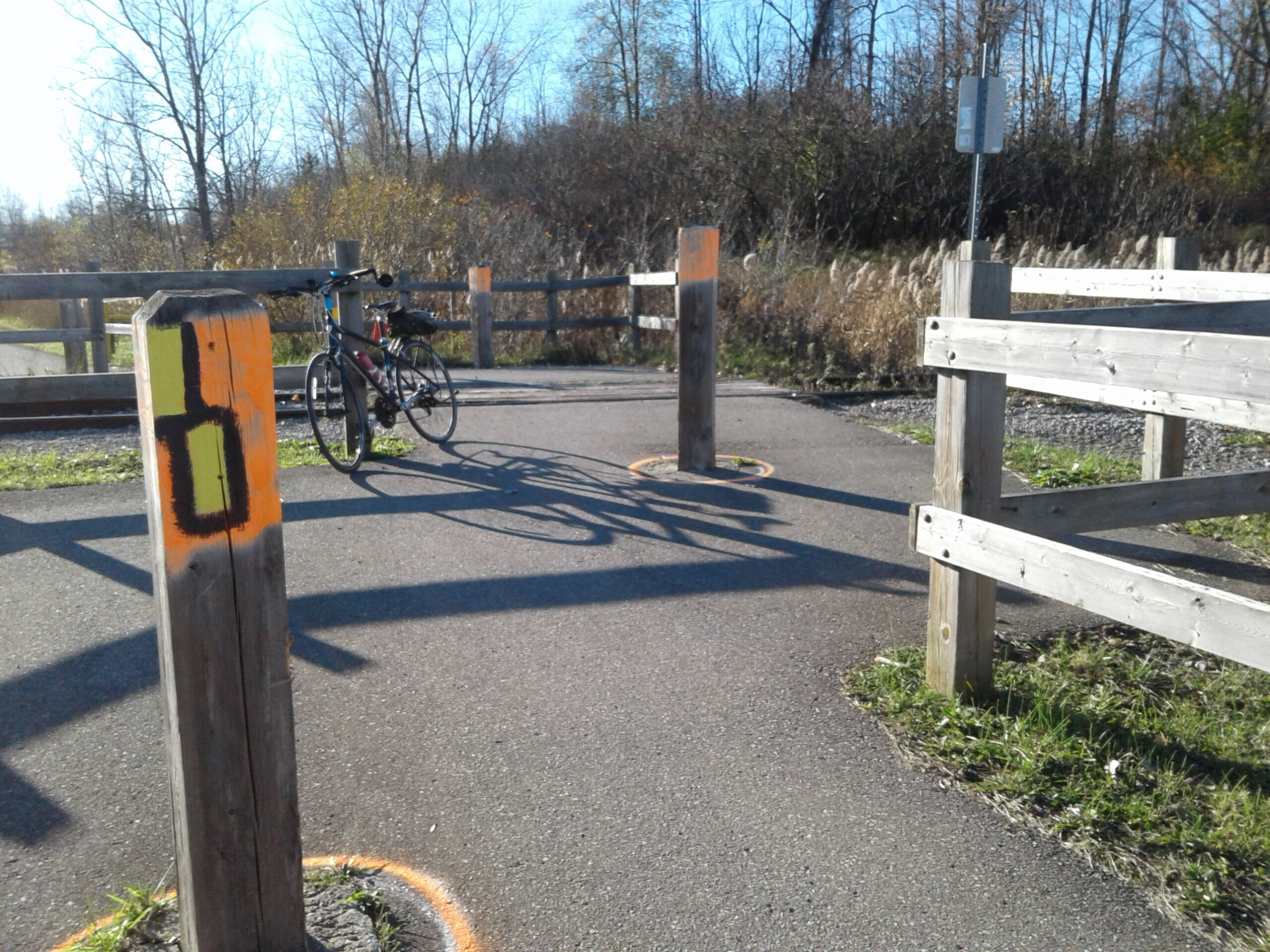 Posts marked for removal at the railway crossing just before the Welland section.
